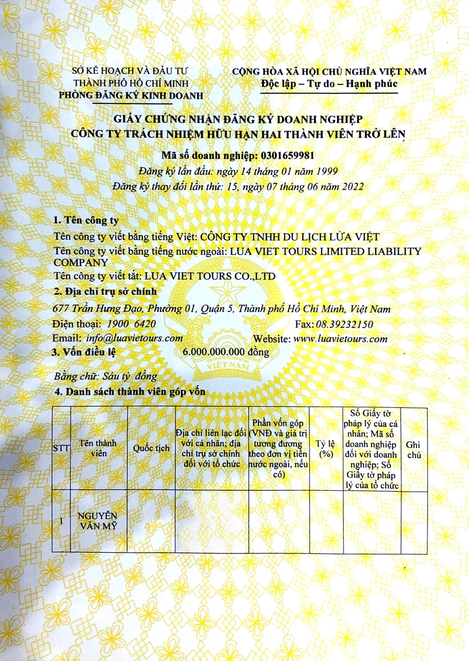 Créé en 1995, Lua Viet Tours possède à la fois ces deux papiers qui lui permettent d’exercer son activité légalement. La photo de ces deux licences accordées à Lua Viet Tours figure en bas de page.