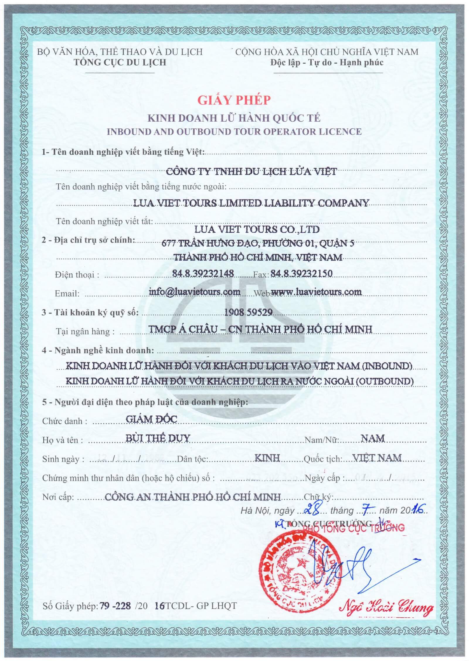 - La licence d’un Tour opérateur international, de numéro 79 -228 /20 16TCDL - GP LHQT, délivrée le 28 juillet 2016 par l’Administration Nationale du Tourisme Vietnamien.